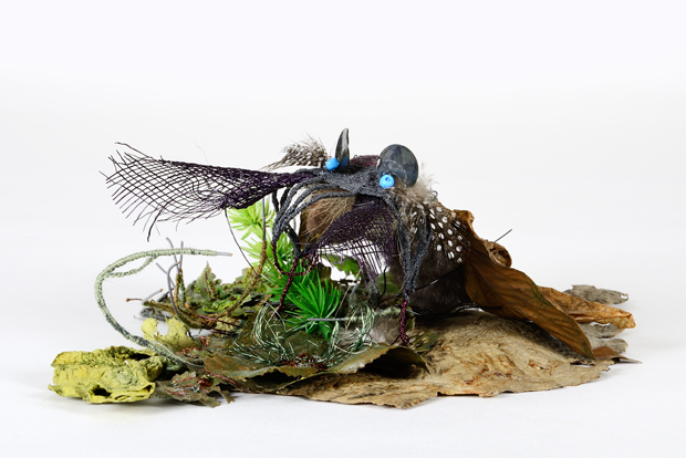 Technique : feuilles artificielles peintes, perles, laine, fourrure, fils métalliques, broderie main et machine.